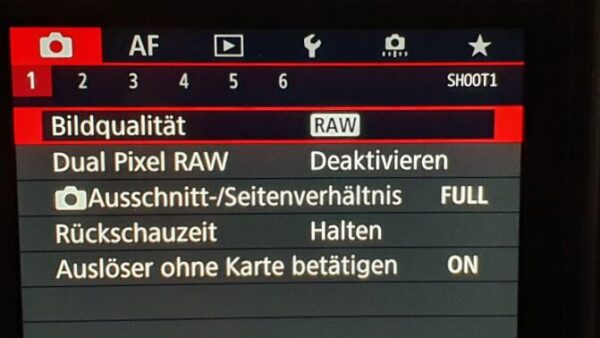 2: Dual-Pixel RAW: Diese Funktion optimiert deine Bilder, korrigierrt den Fokuspunkt und kann auch nützlich sein, wird jedoch nur von der Canon-Software Digital Photo Professional unterstützt. Beachte, dass die Dateien dadurch deutlich größer werden.