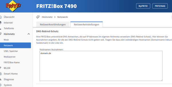 Deine FRITZ!Box verfügt über einen DNS-Rebind-Schutz, der DNS Antworten unterdrück. Hier musst du deine Domain eintragen und dann auf Übernehmen klicken, um die Änderung zu speichern.