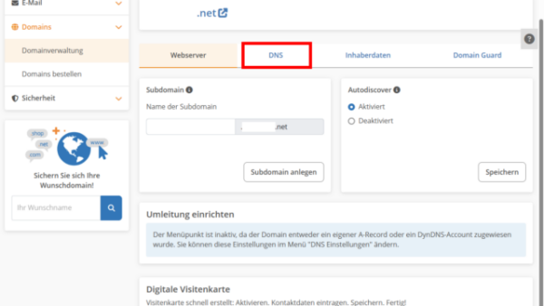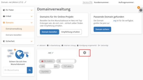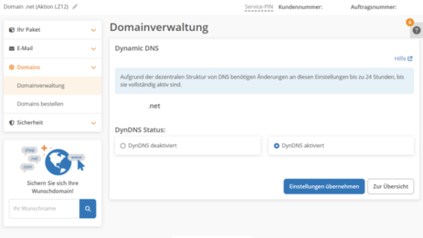 Nachdem du deine Wunschdomain registriert hast, wird es ein paar Stunden dauern (bis 24h) bis sie global registriert ist. Um die nötigen DynDNS Einstellungen zu setzen, meldest du dich bei Strato an und navigierst zur den Domain-Einstellungen: