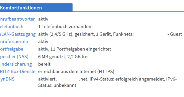 Wenn du dich auf deiner FRITZ!Box anmeldest, kannst auf der Startseite im Bereich der Komfortfunktionen den DynDNS-Status sehen.