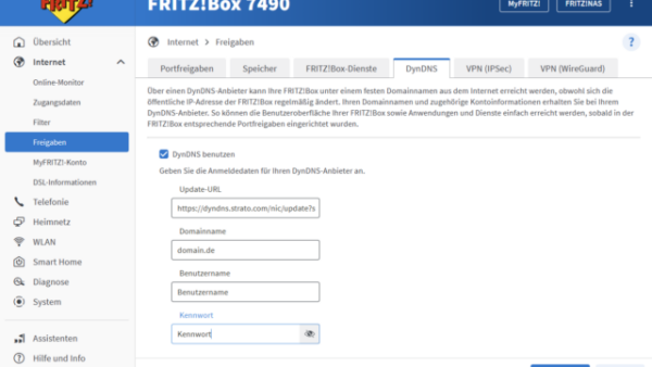 Damit der Domain-Provider auch immer die aktuelle IP-Adresse deines Serveranschlusses bekommt, müssen wir in der FRITZ!Box folgende Informationen eintragen.