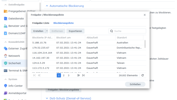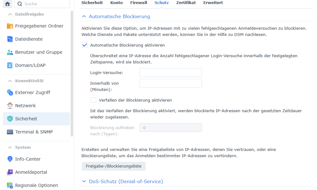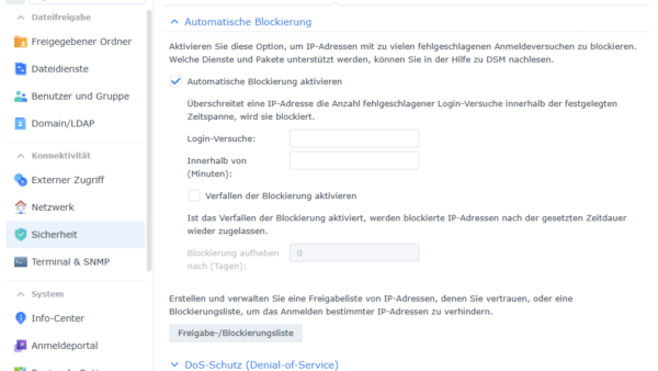 Das Synology DSM erkennt aufgrund des Anmeldeverhalten, ob der Benutzer ein Zugriffsrecht hat oder nicht, indem das System bei mehrfacher falscher Passworteingabe die Client-IP einfach blockiert. Je schärfer die Kontrolle ist, desto sicherer ist das System. Eigentlich ganz einfach, oder?
