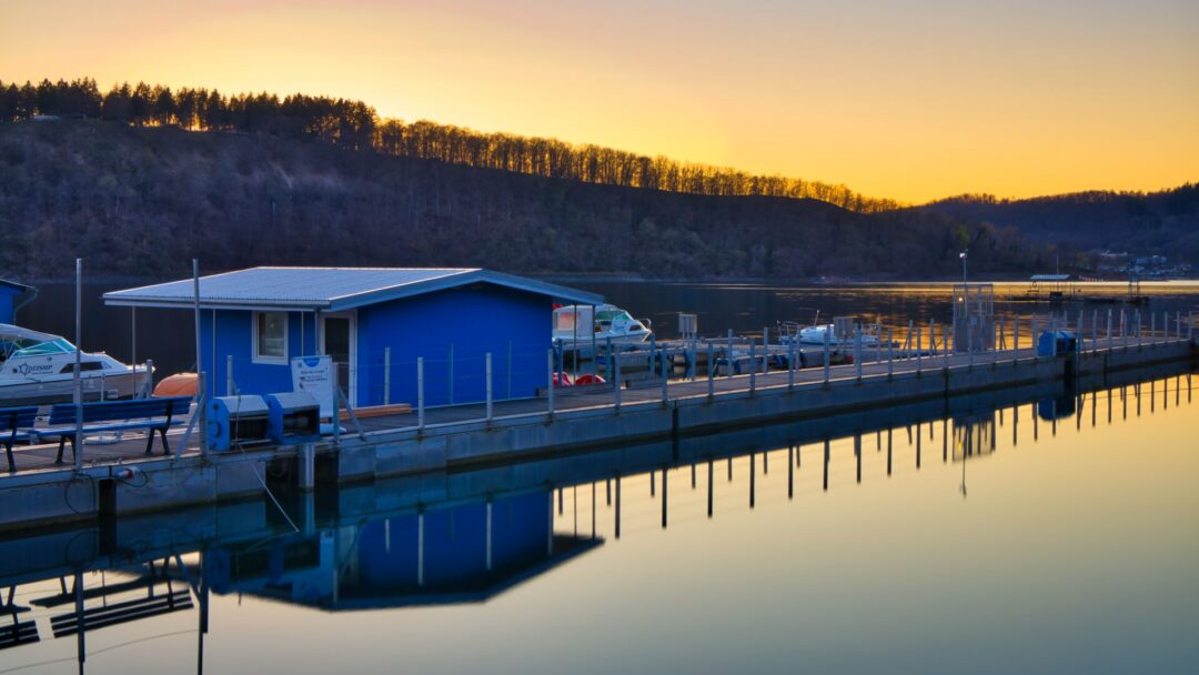 Unterwegs in Hessen am Edertaler Stausee mit dem Ziel, die schöne LED-Beleuchtung der Edertaler Talsperre am Abend zu fotografieren. Dabei hat sich auch ein schönes Bild am See zur goldenen Stunde ergeben.